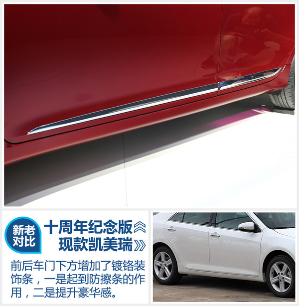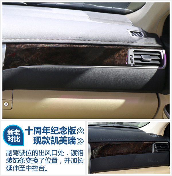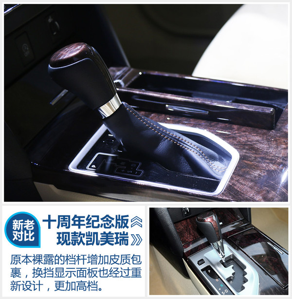凱美瑞的“蛇形”換擋機(jī)制一直是筆者非常喜歡的設(shè)計(jì),最起碼在開車的時(shí)候不會(huì)因?yàn)閾Q錯(cuò)擋而發(fā)生意外碰撞。但是說實(shí)話,裸露的檔桿總覺得缺了點(diǎn)什么。十周年紀(jì)念版將檔桿周圍加上了皮質(zhì)包裹,立馬將中控臺(tái)的“氣質(zhì)”提升了一個(gè)檔次,筆者本人是非常喜歡的。另外,副駕駛面前的木紋面板也增加了一條鍍鉻裝飾。