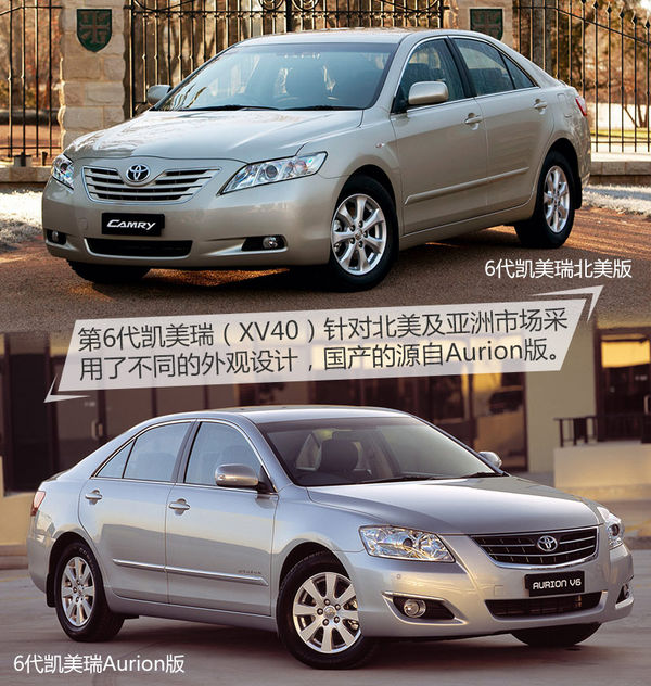第6代凱美瑞(XV40)誕生于2006年,6月17日正式上市,由廣汽豐田進(jìn)行本土化生產(chǎn)。雖然是豐田的全球化車型,但是XV40針對(duì)北美及亞洲市場(chǎng)采用了不同的外觀設(shè)計(jì)。北美版的車燈更加“鋒利”更加年輕運(yùn)動(dòng),而國(guó)產(chǎn)的凱美瑞則采用了更加符合東方審美的亞洲版造型,又被稱作Prestige版或Aurion版。