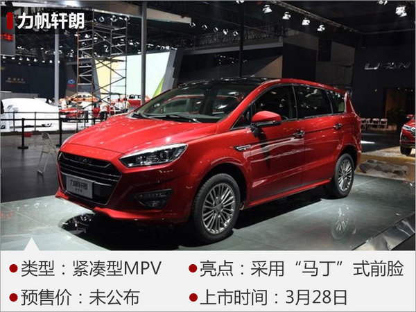 在2016年11月舉行的廣州國(guó)際車(chē)展上,力帆汽車(chē)對(duì)外發(fā)布了全新MPV—軒朗,其“馬丁”式前臉設(shè)計(jì)令人印象深刻,同時(shí)運(yùn)動(dòng)化輪圈與下沉式車(chē)頂?shù)拇钆湟彩窍嗟靡嬲?。?nèi)飾方面,力帆軒朗以黑色為主,中控臺(tái)下方按鍵布局較為簡(jiǎn)潔,實(shí)用性較高。力帆軒朗搭載了1.5L渦輪增壓和2.0L自然吸氣兩款發(fā)動(dòng)機(jī),前者匹配的是8速自動(dòng)變速箱或5速手動(dòng)變速箱,后者則匹配的是5MT或CVT變速箱。新車(chē)將于3月28日正式上市。