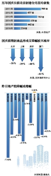 北京在9月30日出臺(tái)的政策影響了市場(chǎng)熱度,市場(chǎng)進(jìn)入了急速冷凍階段。中原地產(chǎn)研究中心統(tǒng)計(jì)數(shù)據(jù)顯示,2016年國(guó)慶長(zhǎng)假期間,7天北京新建住宅簽約216套,二手房住宅簽約209套。合計(jì)簽約425套。而2015年國(guó)慶7天簽約為543套。從簽約數(shù)據(jù)看,北京新建住宅成交量為2011年來(lái)6年最低點(diǎn)。對(duì)此,中原地產(chǎn)首席分析師張大偉分析認(rèn)為,預(yù)計(jì)北京房?jī)r(jià)將快速降溫,四季度漲幅將明顯放緩,在自住房大量供應(yīng)后,部分區(qū)域的價(jià)格很可能出現(xiàn)調(diào)整。
