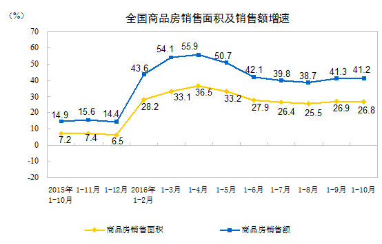 1-10月份,商品房銷售面積120338萬(wàn)平方米,同比增長(zhǎng)26.8%,增速比1-9月份回落0.1個(gè)百分點(diǎn)。其中,住宅銷售面積增長(zhǎng)27.0%,辦公樓銷售面積增長(zhǎng)36.1%,商業(yè)營(yíng)業(yè)用房銷售面積增長(zhǎng)19.3%。商品房銷售額91482億元,增長(zhǎng)41.2%,增速回落0.1個(gè)百分點(diǎn)。其中,住宅銷售額增長(zhǎng)42.6%,辦公樓銷售額增長(zhǎng)56.5%,商業(yè)營(yíng)業(yè)用房銷售額增長(zhǎng)23.2%。