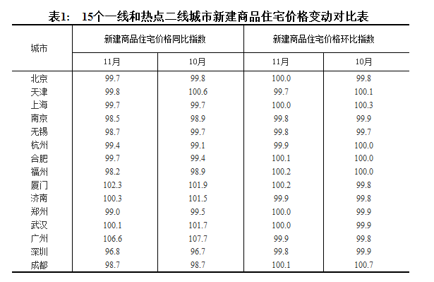 11月份,70個(gè)大中城市中15個(gè)熱點(diǎn)城市房地產(chǎn)市場(chǎng)總體繼續(xù)保持平穩(wěn)。從環(huán)比看,7個(gè)城市新建商品住宅價(jià)格下降,降幅在0.1%至0.3%之間;北京、上海、鄭州和武漢4個(gè)城市環(huán)比持平。