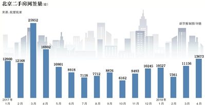 據(jù)我愛我家集團(tuán)市場研究院統(tǒng)計(jì),4月北京二手住宅共網(wǎng)簽13673套,同比2017年4月下滑19.1%,環(huán)比2018年3月上升22.6%。雖然同比仍在下降,但4月的二手房網(wǎng)簽量是去年5月至今12個(gè)月里的最高值。
