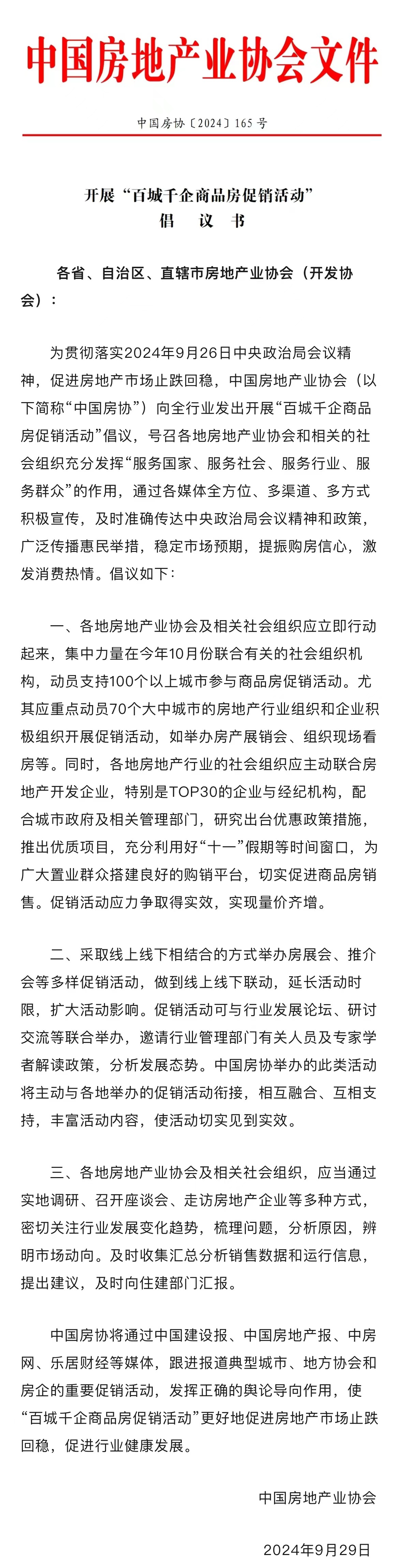 央廣網(wǎng)北京10月11日消息(記者安垚)據(jù)中國房地產(chǎn)業(yè)協(xié)會微信公眾號消息,為貫徹落實9月26日中央政治局會議精神,促進房地產(chǎn)市場止跌回穩(wěn),在住房和城鄉(xiāng)建設(shè)部的指導(dǎo)下,9月29日,中國房地產(chǎn)業(yè)協(xié)會(以下簡稱“中國房協(xié)”)發(fā)出開展“百城千企商品房促銷活動”倡議。