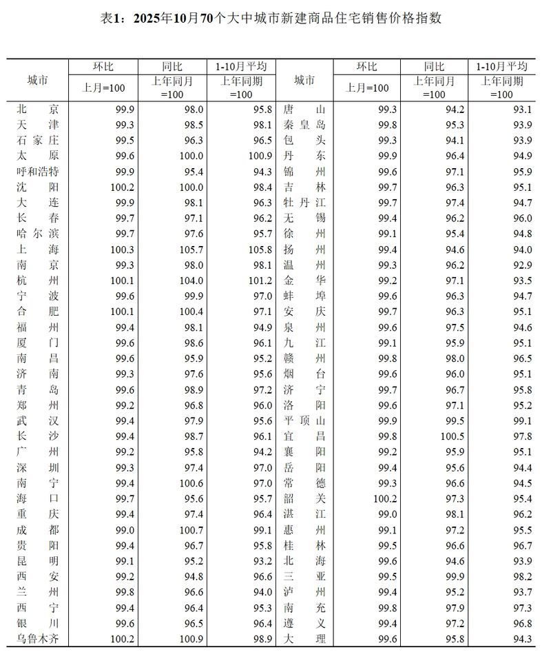 據(jù)國家統(tǒng)計局?jǐn)?shù)據(jù),10月份,一線城市新建商品住宅銷售價格環(huán)比下降0.3%,降幅與上月相同。其中,上海上漲0.3%,北京、廣州和深圳分別下降0.1%、0.8%和0.7%。二線城市新建商品住宅銷售價格環(huán)比下降0.4%,降幅與上月相同。三線城市新建商品住宅銷售價格環(huán)比下降0.5%,降幅擴大0.1個百分點。