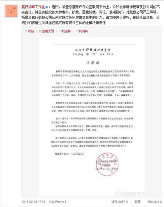 2月28日晚,“楊冪工作室官方微博”發(fā)表律師函,對(duì)近日惡意誹謗楊冪的不實(shí)言論進(jìn)行否認(rèn),稱:“近日,某些惡意賬戶在眾互聯(lián)網(wǎng)平臺(tái)上,公然發(fā)布誹謗楊冪及我公司的不實(shí)言論,并且有組織的大肆發(fā)布、擴(kuò)散,惡意轉(zhuǎn)載、評(píng)論,混淆視聽。對(duì)此我公司嚴(yán)正聲明:楊冪及嘉行影視公司從未實(shí)施過(guò)任何虛假信息中的行為。請(qǐng)立即停止侵權(quán),刪除全部信息,否則我們將通過(guò)法律途徑追究所有侵權(quán)主體的全部法律責(zé)任?!?/p>