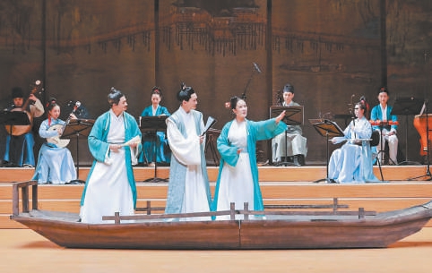 北京民族樂團玖樂室內(nèi)樂組合擔任現(xiàn)場演奏,24首樂曲穿插在劇情中,訴盡人世間的離合悲歡。這些音樂作品既有傳統(tǒng)古曲,也有改編自影視音樂的當代作品片段,與劇情故事的發(fā)展嚴絲合縫地呼應。玖樂室內(nèi)樂組合的成員身穿宋制服裝,坐在舞臺后方,與舞臺正中央的一葉孤舟呼應,讓《人生的盛宴》的舞臺有如古畫。民樂室內(nèi)樂的現(xiàn)場演奏不僅僅是伴奏或添彩,更是劇目呈現(xiàn)不可或缺的一部分。
