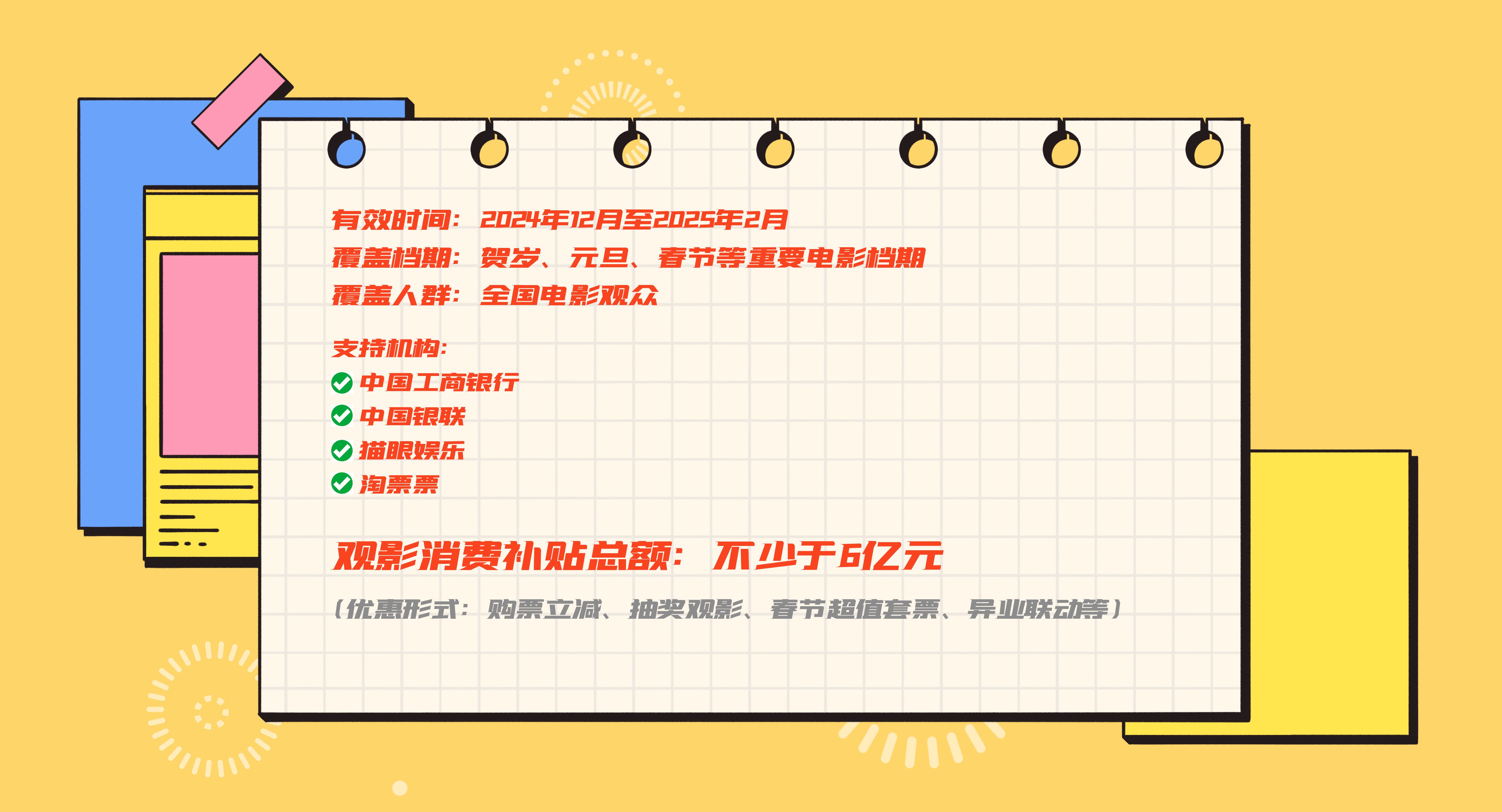 2024年12月9日至2025年2月28日,用戶可通過淘票票App、微信淘票票小程序、支付寶淘票票小程序、淘寶淘票票小程序首頁“全國電影惠民消費季”或“政府補貼”進(jìn)入活動專題頁領(lǐng)取5—50元紅包,并且同時可享受淘票票買一贈一、淘麥VIP積分禮包、88VIP全年觀影優(yōu)惠券、影迷月活動。