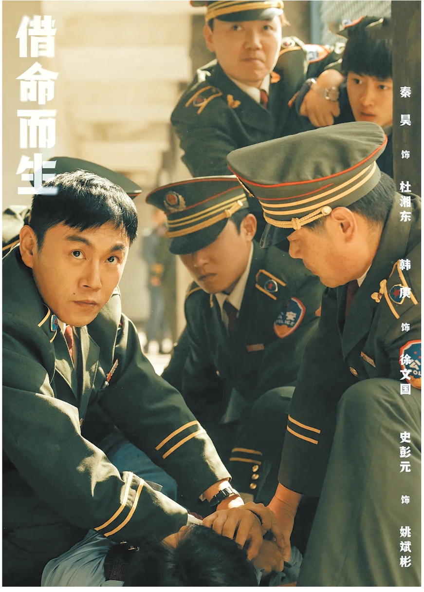 演員的表演處理也指向同樣的藝術(shù)效果。劇中幾場情感表達(dá)的重頭戲,都采取了較為克制的呈現(xiàn)。例如姚斌彬槍決前夜與母親訣別的場面,主要表演內(nèi)容是艾麗婭飾演的崔麗珍凄惶、焦急地穿過重重鐵門,姚斌彬做出了含淚抬頭的反應(yīng)。接著崔麗珍短促地喚了一聲“兒子”,姚斌彬崩潰著下跪。演員情感飽滿的表演,在有限的篇幅中形成簡潔有力表達(dá)效果。還有多年后杜湘東得知姚斌彬被冤的真相后,極度痛心和憤怒的表演段落。從人物情緒爆發(fā)掀了桌子開始,之前的中景拍攝切換為全景拍攝,秦昊的怒吼、掩面、捶打等發(fā)泄性的動作,因為拍攝視點的遠(yuǎn)離,被納入到街景的整體畫面中,顯得徒勞無力,甚至有些荒誕。這些處理方式,呈現(xiàn)出作品對復(fù)雜性的追求與嘗試,構(gòu)成了《借命而生》獨特的藝術(shù)風(fēng)格。