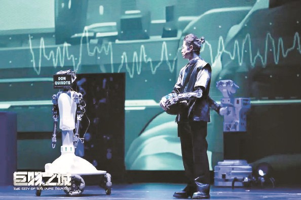 這是國內(nèi)首部機(jī)器人戲劇《巨物之城》的演出現(xiàn)場(chǎng)。演員與機(jī)器人一同完成了80分鐘的表演,謝幕后,臺(tái)下觀眾涌上舞臺(tái),爭相與“堂吉訶德”“麒麟臂”“嵐”等機(jī)器人合影、問好。機(jī)器人——這個(gè)在日常生活中還頗為“遙遠(yuǎn)”的形象,第一次以情感表達(dá)者的身份,走近了普通觀眾。