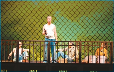 演出開場,鐵絲網(wǎng)幕在昏暗的冷光里升起,囚犯們?cè)阼F籠里形如困獸。這一場景勾勒出肖申克監(jiān)獄的陰森可怖,壓迫感令人屏息。遇到暴力沖突時(shí),血紅色燈光瞬間籠罩舞臺(tái),渲染出緊張氛圍。每逢監(jiān)獄操場上的閑談時(shí)刻,暖黃色燈光灑下,幕布上的高墻外飄著幾行疏云,透出難得的安適。