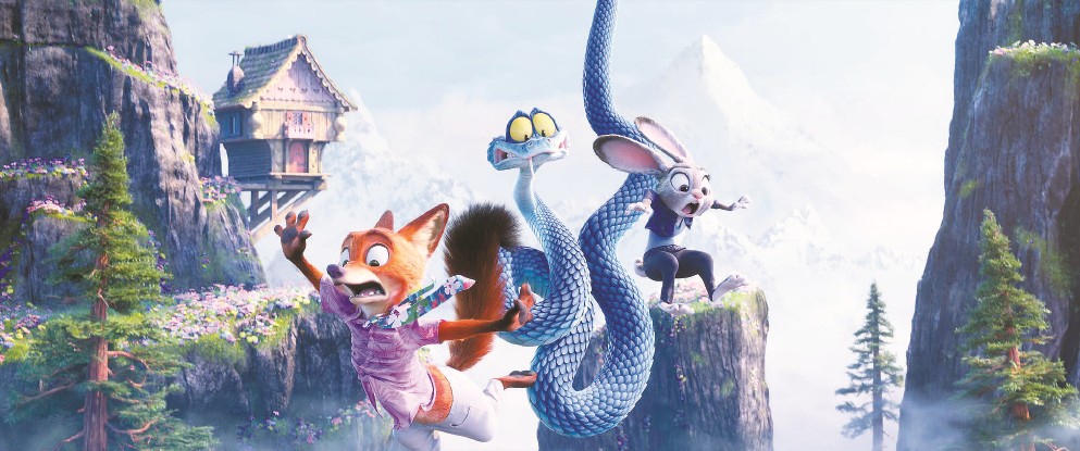 不過《瘋狂動物城2》的“奔跑”意涵并不會上升到《羅拉快跑》的哲思層面。動物們的一路狂奔自然也是為了成就影片的“好看”。從冰山雪川到熱帶雨林,從沙漠風(fēng)生到沼澤水起,汽車追逐要的是光怪陸離的街景,水里逃生要的是窒息壓迫的氛圍,冰雪對決要的是蒼茫一片的天地。觀眾們的視線跟隨著動物角色的行動高速地移轉(zhuǎn),從一個驚奇進入下一個驚奇,從一處景觀轉(zhuǎn)入下一個景觀,這種步移景換的觀看,與他們在迪士尼游樂園里進行沉浸式大型項目的體驗非常相似。只不過,目迷五色的“眩暈”體驗從5分鐘延長到了100分鐘。未來的一個市場可能大概是,人們會有機會在某處的迪士尼樂園項目中重溫熟悉而親切的瘋狂動物城記憶。
