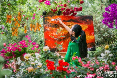 13日,舞蹈家楊麗萍在微博曬出一組自己在花園中作畫(huà)的照片。只見(jiàn)楊麗萍民族風(fēng)裝扮,而她所在的周?chē)r花滿布,姹紫嫣紅,還不時(shí)地有幾只鳥(niǎo)落在身旁,好似人間仙境。