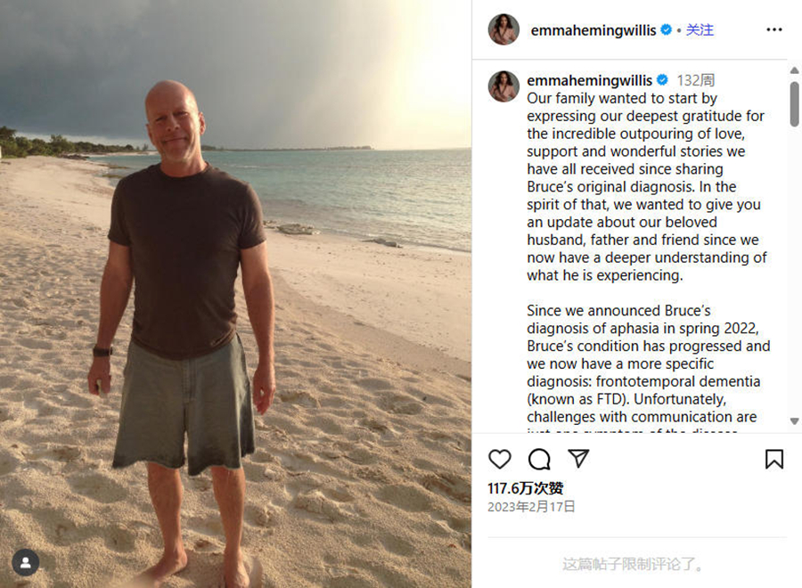 艾瑪·海明·威利斯。來(lái)源:視頻截圖 大銀幕上,布魯斯·威利斯曾給影迷留下無(wú)數(shù)經(jīng)典回憶。風(fēng)靡全球的《虎膽龍威》系列電影中,他成功塑造的“打不死的孤膽警探”約翰·麥卡倫深入人心。在40多年的演藝生涯中,威利斯曾出演《藍(lán)色月光》《低俗小說(shuō)》《第五元素》《十二猴子》《第六感》《世界末日》《赤焰戰(zhàn)場(chǎng)》等不同類型的影視作品,被稱為“熒幕上不敗的硬漢”。 2022年,布魯斯·威利斯的家人發(fā)布聯(lián)合聲明,宣布他將退出演藝事業(yè)。因?yàn)樗辉\斷患上失語(yǔ)癥,這影響了他的認(rèn)知能力和溝通能力。一年后,家人再次發(fā)文透露,他的病情進(jìn)一步發(fā)展,且有了更具體的診斷結(jié)果:額顳葉癡呆(FTD)。