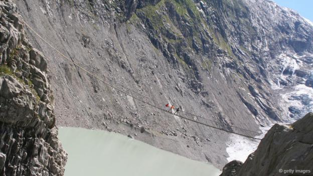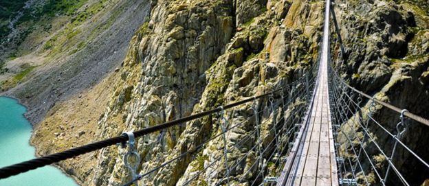 在所有懸索橋中,最令人驚心動(dòng)魄的應(yīng)該就是特里夫特懸索橋了。該橋長(zhǎng)170米,跨伯爾尼高地的特里夫特斯湖,湖面與橋之間無任何連接,湖光山色冰川美景盡收眼底,每年吸引著成千上萬名渡橋者前來游覽。