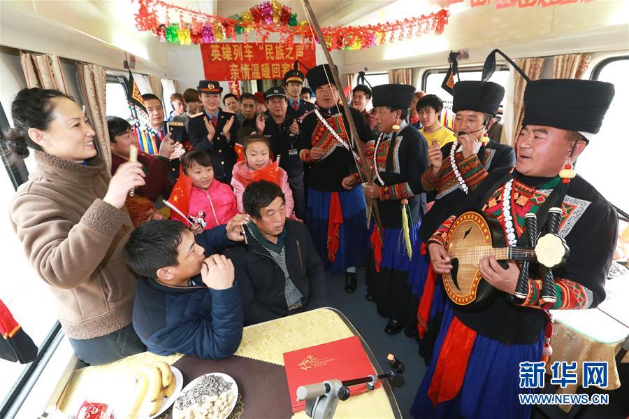 2月1日,彝族藝術家在K165次列車上為旅客表演。當日,在西安鐵路局西安至昆明的K165次列車上,四川美姑縣原生態(tài)畢摩樂隊與西安客運段職工民樂小分隊聯(lián)合舉辦“英雄列車民族之聲親情溫暖回家路”音樂會,畢摩樂隊用口弦、哈門、木葉、瑪布等彝族民間樂器演奏的音樂為返鄉(xiāng)過年的旅客提前送上新年祝福。民間藝術家和列車乘務員還為旅客們送上“福”字、春聯(lián)。新華社發(fā)