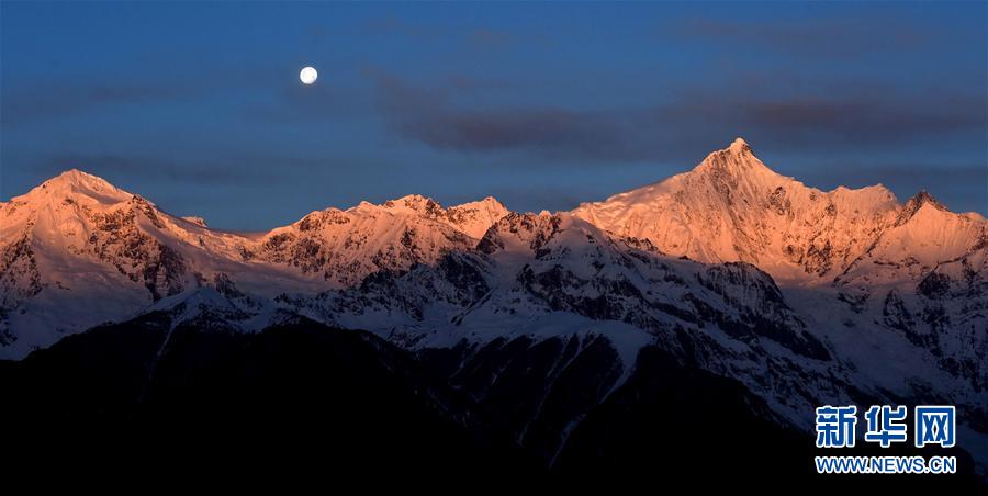 這是3月25日清晨拍攝的梅里雪山“日月同輝”景觀。梅里雪山位于滇藏交界的云南省迪慶藏族自治州德欽縣境內(nèi),是世界自然遺產(chǎn)“三江并流”的主要自然景觀之一。梅里雪山常年云霧籠罩,太陽(yáng)光只在少數(shù)天晴的清晨照射在雪山頂上,形成絕美的“日照金山”美景。有時(shí)月亮尚未落山,太陽(yáng)已經(jīng)升起,更是形成了難得一見的梅里雪山“日月同輝”奇觀。新華社記者 王長(zhǎng)山 攝