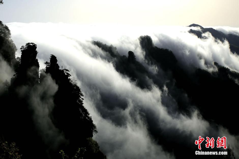 4月18日,雨過(guò)天晴的湖南張家界核心景區(qū)武陵源出現(xiàn)壯觀的“云瀑”景觀。雪白的濃云從峰林間向下翻騰,猶如天河傾瀉,氣勢(shì)磅礴。 吳勇兵 攝