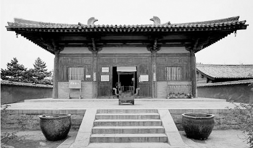 南禪寺位于山西五臺(tái)縣城西南22公里李家莊西側(cè)。坐北向南,有山門、龍王殿、菩薩殿和大佛殿等主要建筑,圍成一個(gè)四合院形式。創(chuàng)建年代不詳,大殿平梁下保存有墨書題記,足證重建于唐建中三年(782)。晚唐時(shí)武宗“會(huì)昌滅法”幸免毀壞,是我國現(xiàn)存最古的唐代木構(gòu)建筑。大殿面寬進(jìn)深各三間,單檐歇山式屋頂,殿前有寬敞的月臺(tái),柱上安有雄健的斗拱,承托屋檐,殿內(nèi)無柱,四椽桴通達(dá)前后檐柱之外,梁架結(jié)構(gòu)簡練,屋頂舉折平緩。說明我國唐代建筑技術(shù)已有很高水平,而且已普及到偏僻山村。
