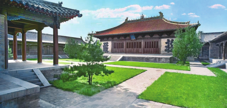永安寺,原稱渾源州永安禪寺及神州大永安禪寺,俗稱“大寺”,始建于金,金元之交被火毀后重建,明、清以來(lái)均曾在當(dāng)?shù)毓賳T倡導(dǎo)下續(xù)建與增修。該寺位于渾源古城東北隅,坐西北朝東南,本為以中軸線為主,東西軸各輔以跨院或偏院的五進(jìn)場(chǎng)院空間大型寺廟建筑群,現(xiàn)僅存前院及東西跨院和中院主體建筑群,東西寬52米,南北深78米,占地面積4056平方米。寺內(nèi)現(xiàn)存文物建筑物7座、清代壁畫(huà)305.4平方米、建筑彩畫(huà)2118平方米,古代碑碣2方,石獅一對(duì)。主殿傳法正宗殿為元延祐二年(1315年)原構(gòu),是我國(guó)建筑史上廡殿頂建筑的杰作,殿內(nèi)滿堂水陸畫(huà)、建筑彩畫(huà)及殿頂五彩琉璃均保存完好且異常精美,聞名遐邇。