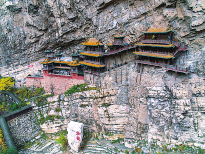 懸空寺位于恒山第二主峰翠屏峰的半崖峭壁間,始建于北魏后期,距今已有1500多年的歷史。整個(gè)建筑上載危巖,下臨深谷,樓閣懸空,結(jié)構(gòu)奇巧,是我國(guó)古建筑中罕見(jiàn)的杰作,堪稱“天下一絕”。詩(shī)仙李白游懸空寺后揮毫寫(xiě)下“壯觀”二字,以表其懷。明代旅行家徐霞客在其著作《徐霞客游記》中稱贊懸空寺為“天下巨觀”。歷史文化名城保護(hù)委員會(huì)副主任、著名文物專家鄭孝燮視察懸空寺后題詞:“懸空寺玄、絕、奇、險(xiǎn),百來(lái)百看不厭”。