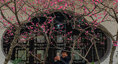 近日,上海青浦區(qū)曲水園內(nèi),紅梅、白梅、蠟梅競相綻放,吸引眾多市民前來賞花。王初攝(人民圖片網(wǎng))