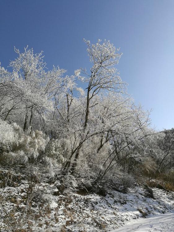 受較強冷空氣影響,秦嶺腹地涼風埡山頂,出現(xiàn)大面積霧凇景觀。玉樹瓊枝,晶瑩剔透,讓涼風埡山頂變得像童話世界一般,美不勝收。 央視記者王志杰 圖片來源:央視新聞微博