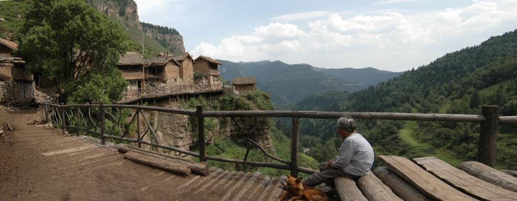隱沒在深山老林中的王化溝分布在大約一華里長的絕壁上,背依懸崖,面臨百丈深淵。全村20余戶,60多口人。村西的懸崖上聳立著一塊巨石,村里人稱之為“石人”,村后的山也因此稱作“石人山”。村中的房子大都臨崖而建,以木柱支撐,高低錯(cuò)落,避風(fēng)向陽。這些房子建在懸崖上看似危險(xiǎn),實(shí)則非常堅(jiān)固,至今還有清代的房子保存完好。由于地盤不足,所以沒了庭院,只有一條走廊。就是街道也只能用木料搭建,懸于空中。當(dāng)然作為農(nóng)家,牲畜的圈舍是免不了的,這里也需要精心擺布,精心建造,絕不至于讓牲畜落下深淵。