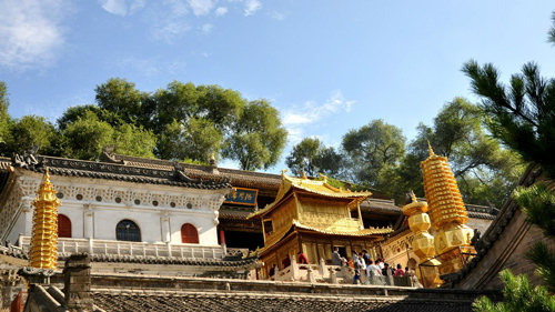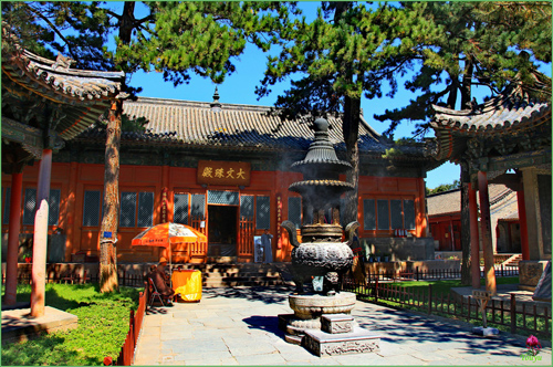 顯通寺的大雄寶殿為舉行佛事活動主要場所,是顯通寺的第三重大殿,殿內(nèi)供著三尊佛像:中是釋迦牟尼佛,西是阿彌陀佛,東是藥師佛;兩旁有十八羅漢像背后有觀音、文殊、普賢三尊菩薩像。觀音殿殿內(nèi),中間供著觀音菩薩像,左右供著文殊和普賢菩薩像。大文殊殿,是顯通寺的第二重大殿。大文殊殿內(nèi),供著七尊文殊菩薩像:正中的為大智文殊;前面的五位,從左至右,依次為西臺獅子文殊,南臺智慧文殊,中臺孺者文殊,北臺無垢文殊,東臺聰明文殊;大智文殊后面是甘露文殊。文殊像前有護法神韋馱像,兩側(cè)有十八羅漢像。