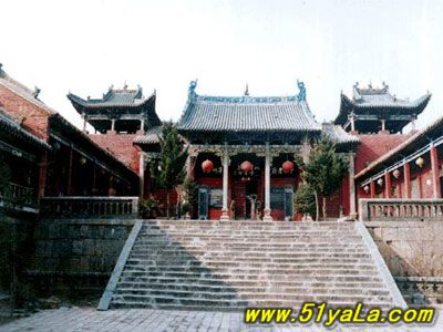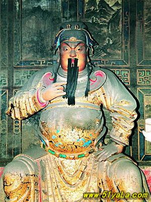 前行有午門.是一座面闊五間,單檐廡殿頂、石雕回廊的廳式建筑。周圍有石欄桿,欄板正反兩面浮雕各類圖案、人物144幅,洋洋大觀,頗有童趣。廳內(nèi)南有周倉(cāng)、廖化畫像,軒昂威武。北面左右兩側(cè),彩繪著關(guān)羽戎馬一生的主要經(jīng)歷,起于桃園三結(jié)義,止于水淹七軍,只是沒有走麥城這個(gè)情節(jié),在全國(guó)關(guān)廟壁畫中都按此進(jìn)行,據(jù)說(shuō)這是因忌諱關(guān)羽自高自大而被殺,終于造成蜀國(guó)的覆滅而隱去的。穿過午門,經(jīng)“山海鐘靈”坊、御書樓,便是關(guān)帝廟主體建筑崇寧殿。