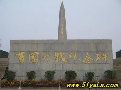 “百團大戰(zhàn)紀念碑”座北朝南,由主碑、三座副碑、一座大型圓雕、兩座題字碑、四個烽火臺和長 227米蜿蜒起伏的長城組成,于1987年6月30日建成。