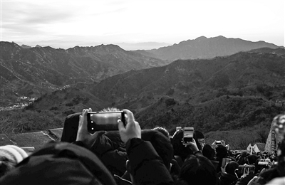 2018年一天,來(lái)自各地的數(shù)百游客在早晨6時(shí)許,紛紛登上慕田峪長(zhǎng)城,迎接2018年的第一縷曙光,為新的一年祈福。