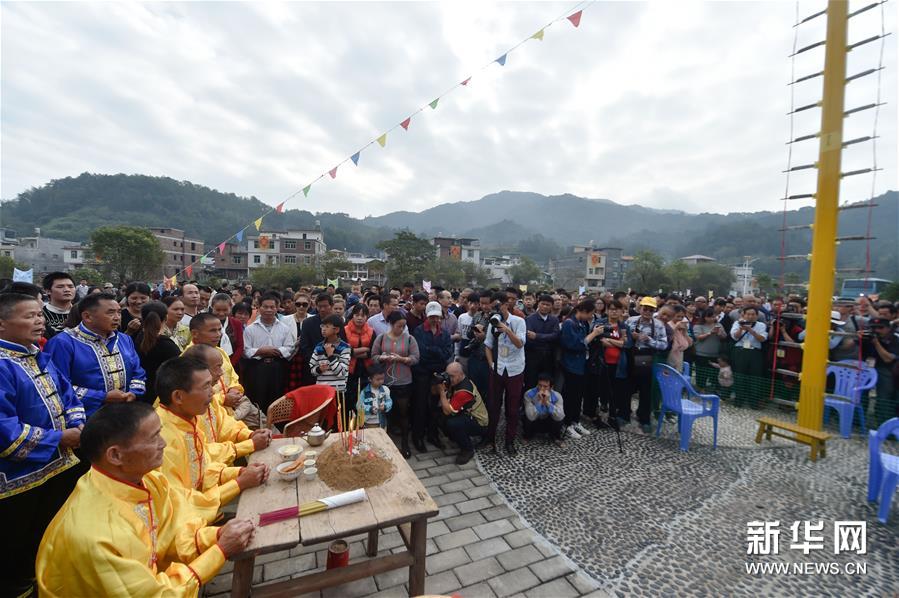 農(nóng)歷十月十五前后,福建西部武平縣各山村陸續(xù)進入農(nóng)閑時節(jié)。按照當?shù)仫L俗,不同村子各自擇日舉辦民間活動,其中較有代表性的就是“上刀山”絕技?!吧系渡健苯^技在閩西山村流傳已有數(shù)百年歷史,表演者需光腳順著磨得鋒利閃亮的36把鋼刀,攀登至8米高的杉木柱子頂部,接受長者祝福,祈求風調(diào)雨順、五谷豐登。新華社記者 宋為偉 攝