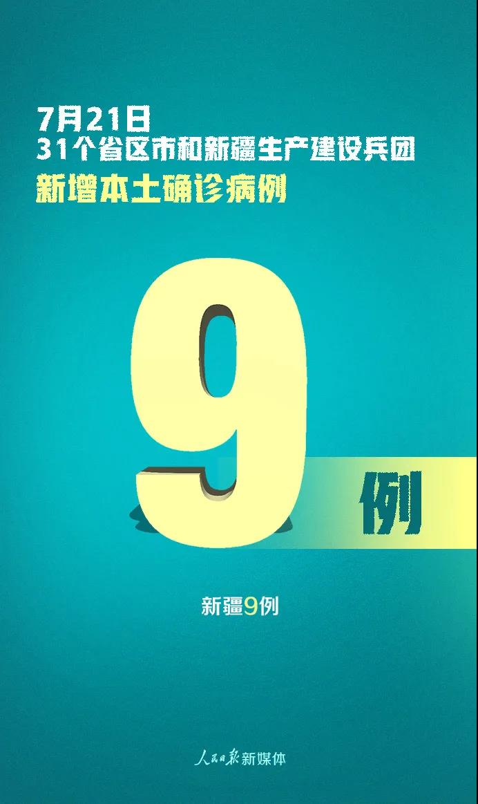 7月21日0—24時,31個省(自治區(qū)、直轄市)和新疆生產(chǎn)建設(shè)兵團報告新增確診病例14例,其中境外輸入病例5例(上海2例,廣東2例,云南1例),本土病例9例(均在新疆);無新增死亡病例;無新增疑似病例。