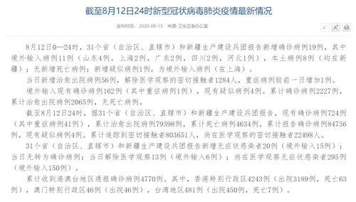 人民網北京8月13日電(董童)國家衛(wèi)生健康委于今日在官網發(fā)布的《截至8月12日24時新型冠狀病毒肺炎疫情最新情況》(以下簡稱“情況”)提出,8月12日0—24時,31個?。ㄗ灾螀^(qū)、直轄市)和新疆生產建設兵團報告新增確診病例19例,其中境外輸入病例11例(山東4例,上海2例,廣東2例,四川2例,河北1例),本土病例8例(均在新疆);無新增死亡病例;新增疑似病例1例,為境外輸入病例(在上海)。當日新增治愈出院病例56例,解除醫(yī)學觀察的密切接觸者1284人,重癥病例較前一日增加1例。