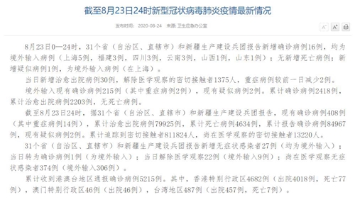 情況顯示,截至8月23日24時,據(jù)31個省(自治區(qū)、直轄市)和新疆生產(chǎn)建設(shè)兵團(tuán)報告,現(xiàn)有確診病例408例(其中重癥病例14例),累計(jì)治愈出院病例79925例,累計(jì)死亡病例4634例,累計(jì)報告確診病例84967例,現(xiàn)有疑似病例2例。累計(jì)追蹤到密切接觸者811824人,尚在醫(yī)學(xué)觀察的密切接觸者13220人。