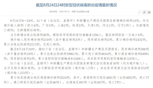 情況顯示,截至8月24日24時,據(jù)31個?。ㄗ灾螀^(qū)、直轄市)和新疆生產(chǎn)建設(shè)兵團報告,現(xiàn)有確診病例386例(其中重癥病例10例),累計治愈出院病例79961例,累計死亡病例4634例,累計報告確診病例84981例,現(xiàn)有疑似病例2例。累計追蹤到密切接觸者812268人,尚在醫(yī)學觀察的密切接觸者12370人。