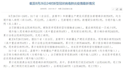 情況顯示,截至8月26日24時(shí),據(jù)31個(gè)省(自治區(qū)、直轄市)和新疆生產(chǎn)建設(shè)兵團(tuán)報(bào)告,現(xiàn)有確診病例324例(其中重癥病例4例),累計(jì)治愈出院病例80046例,累計(jì)死亡病例4634例,累計(jì)報(bào)告確診病例85004例,現(xiàn)有疑似病例1例。累計(jì)追蹤到密切接觸者813571人,尚在醫(yī)學(xué)觀察的密切接觸者11227人。