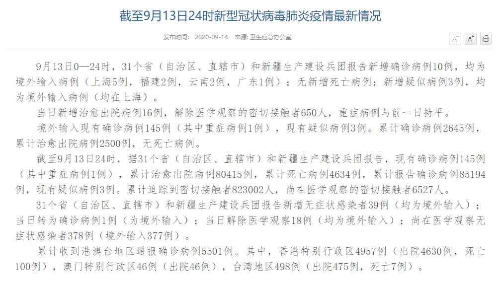 人民網(wǎng)北京9月14日(董童)國(guó)家衛(wèi)生健康委于今日在官網(wǎng)發(fā)布的《截至9月13日24時(shí)新型冠狀病毒肺炎疫情最新情況》(以下簡(jiǎn)稱(chēng)“情況”)提出,9月13日0—24時(shí),31個(gè)?。ㄗ灾螀^(qū)、直轄市)和新疆生產(chǎn)建設(shè)兵團(tuán)報(bào)告新增確診病例10例,均為境外輸入病例(上海5例,福建2例,云南2例,廣東1例);無(wú)新增死亡病例;新增疑似病例3例,均為境外輸入病例(均在上海)。當(dāng)日新增治愈出院病例16例,解除醫(yī)學(xué)觀察的密切接觸者650人,重癥病例與前一日持平。