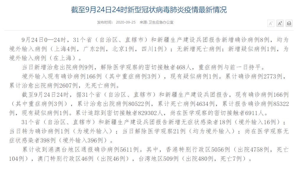 人民網(wǎng)北京9月25日電(董童)國(guó)家衛(wèi)生健康委于今日在官網(wǎng)發(fā)布的《截至9月24日24時(shí)新型冠狀病毒肺炎疫情最新情況》(以下簡(jiǎn)稱“情況”)顯示,9月24日0—24時(shí),31個(gè)?。ㄗ灾螀^(qū)、直轄市)和新疆生產(chǎn)建設(shè)兵團(tuán)報(bào)告新增確診病例8例,均為境外輸入病例(上海4例,廣東2例,北京1例,四川1例);無(wú)新增死亡病例;新增疑似病例1例,為境外輸入病例(在上海)。當(dāng)日新增治愈出院病例9例,解除醫(yī)學(xué)觀察的密切接觸者468人,重癥病例與前一日持平。