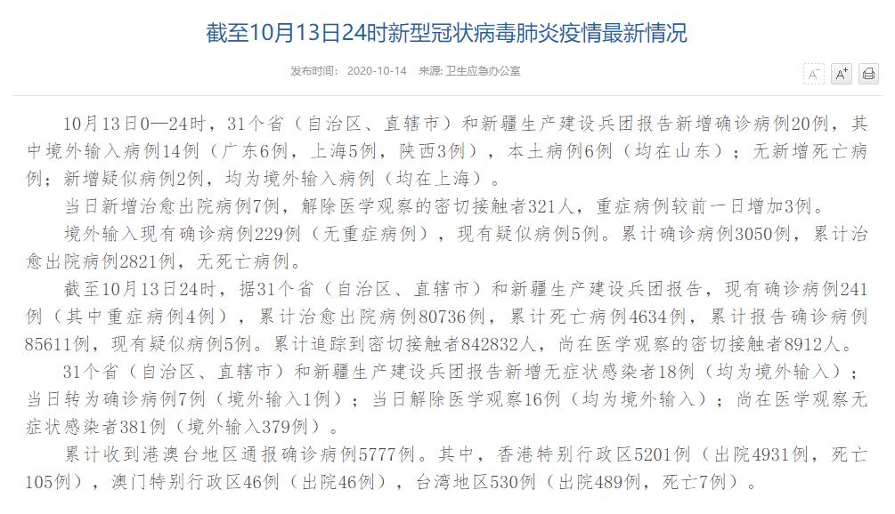 人民網(wǎng)北京10月14日電(董童)國家衛(wèi)生健康委于今日在官網(wǎng)發(fā)布的《截至10月13日24時(shí)新型冠狀病毒肺炎疫情最新情況》(以下簡稱“情況”)稱,10月13日0—24時(shí),31個(gè)?。ㄗ灾螀^(qū)、直轄市)和新疆生產(chǎn)建設(shè)兵團(tuán)報(bào)告新增確診病例20例,其中境外輸入病例14例(廣東6例,上海5例,陜西3例),本土病例6例(均在山東);無新增死亡病例;新增疑似病例2例,均為境外輸入病例(均在上海)。當(dāng)日新增治愈出院病例7例,解除醫(yī)學(xué)觀察的密切接觸者321人,重癥病例較前一日增加3例。