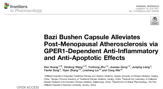 近日,南京中醫(yī)藥大學(xué)附屬中西醫(yī)結(jié)合醫(yī)院黃丹博士關(guān)于“八子補(bǔ)腎膠囊通過抗炎和抗凋亡作用減輕絕經(jīng)后粥樣動(dòng)脈硬化”研究,6月25日發(fā)表在國際學(xué)術(shù)期刊《Frontiers in Psychology》上(影響因子為5.810)。