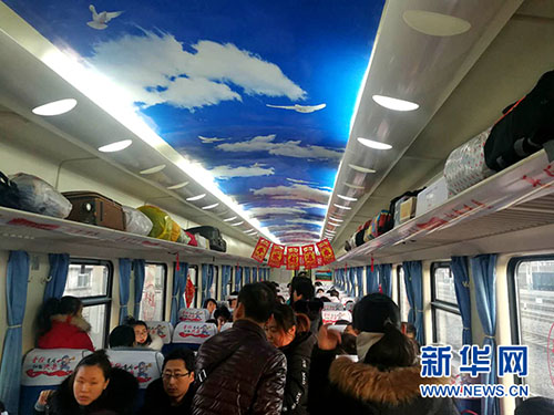 一首《十送紅軍》在車廂里回響,車窗上貼滿“?!弊旨艏?。扶貧火車“蔡家崖”號21日滿載旅客駛向呂梁山,迎來開通后的第一個春運(yùn)。