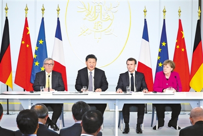 | 3月26日,國家主席習近平在巴黎同法國總統(tǒng)馬克龍一道出席中法全球治理論壇閉幕式。德國總理默克爾、歐盟委員會主席容克應邀出席。 新華社記者 鞠 鵬攝 |