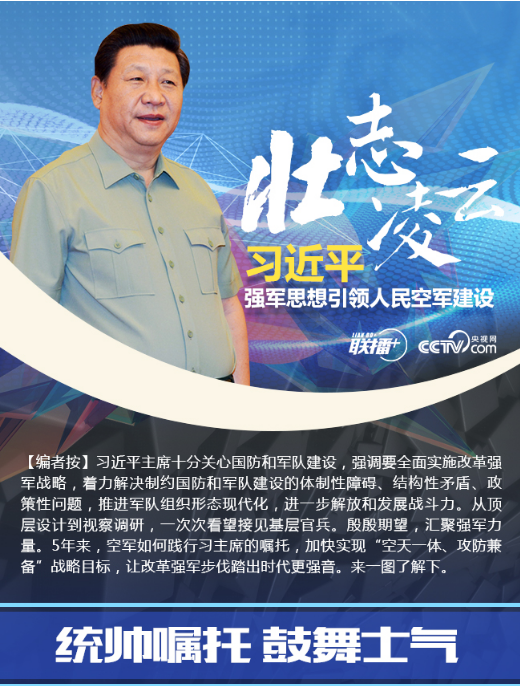 【聯(lián)播+】5年前的4月14日,中共中央總書記、國家主席、中央軍委主席習(xí)近平專程到空軍機(jī)關(guān)調(diào)研空軍建設(shè)和軍事斗爭準(zhǔn)備,代表黨中央、中央軍委向空軍全體官兵致以誠摯的問候,強(qiáng)調(diào)要加快建設(shè)一支空天一體、攻防兼?zhèn)涞膹?qiáng)大人民空軍,為實(shí)現(xiàn)中國夢、強(qiáng)軍夢提供堅強(qiáng)力量支撐。