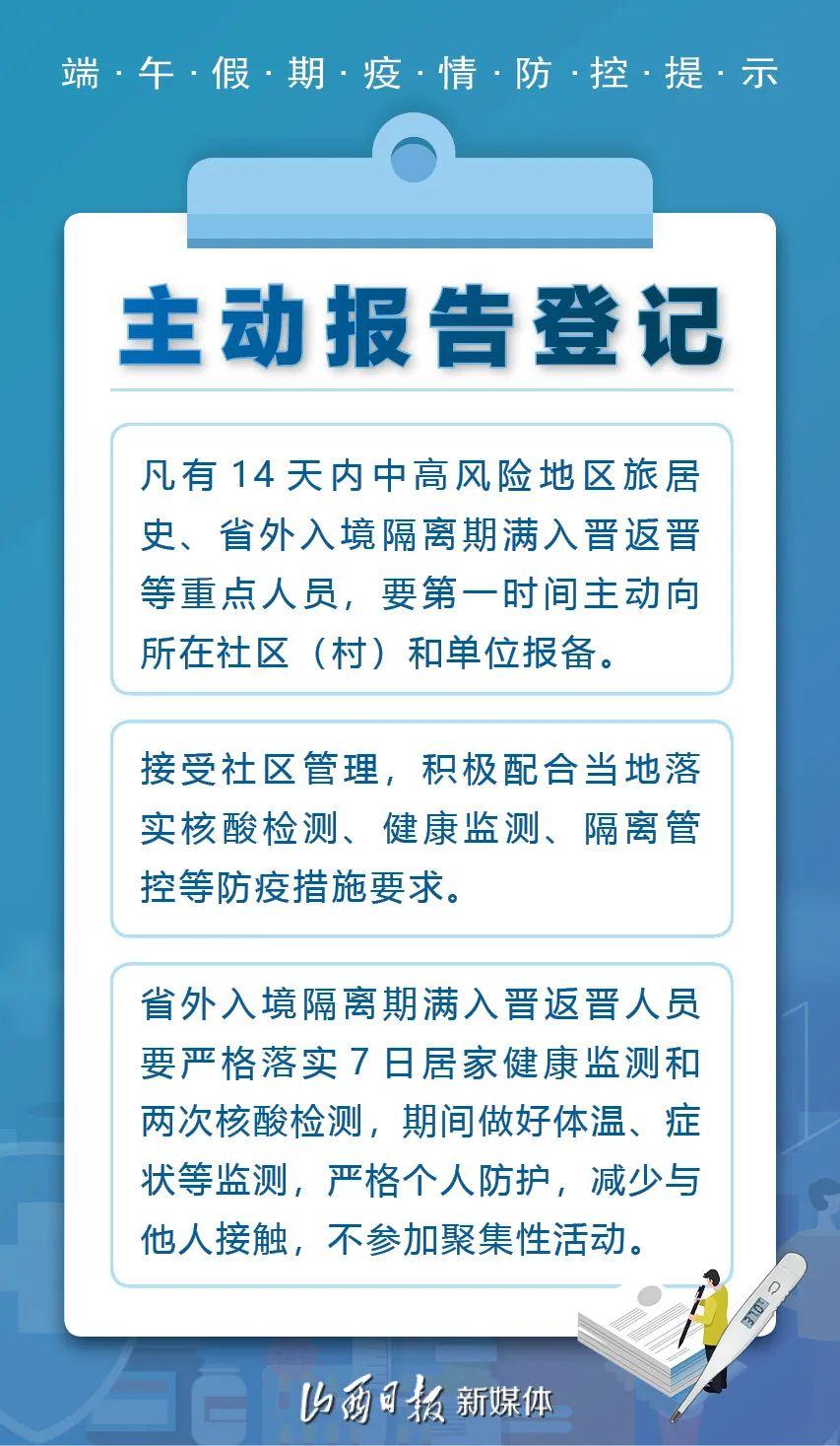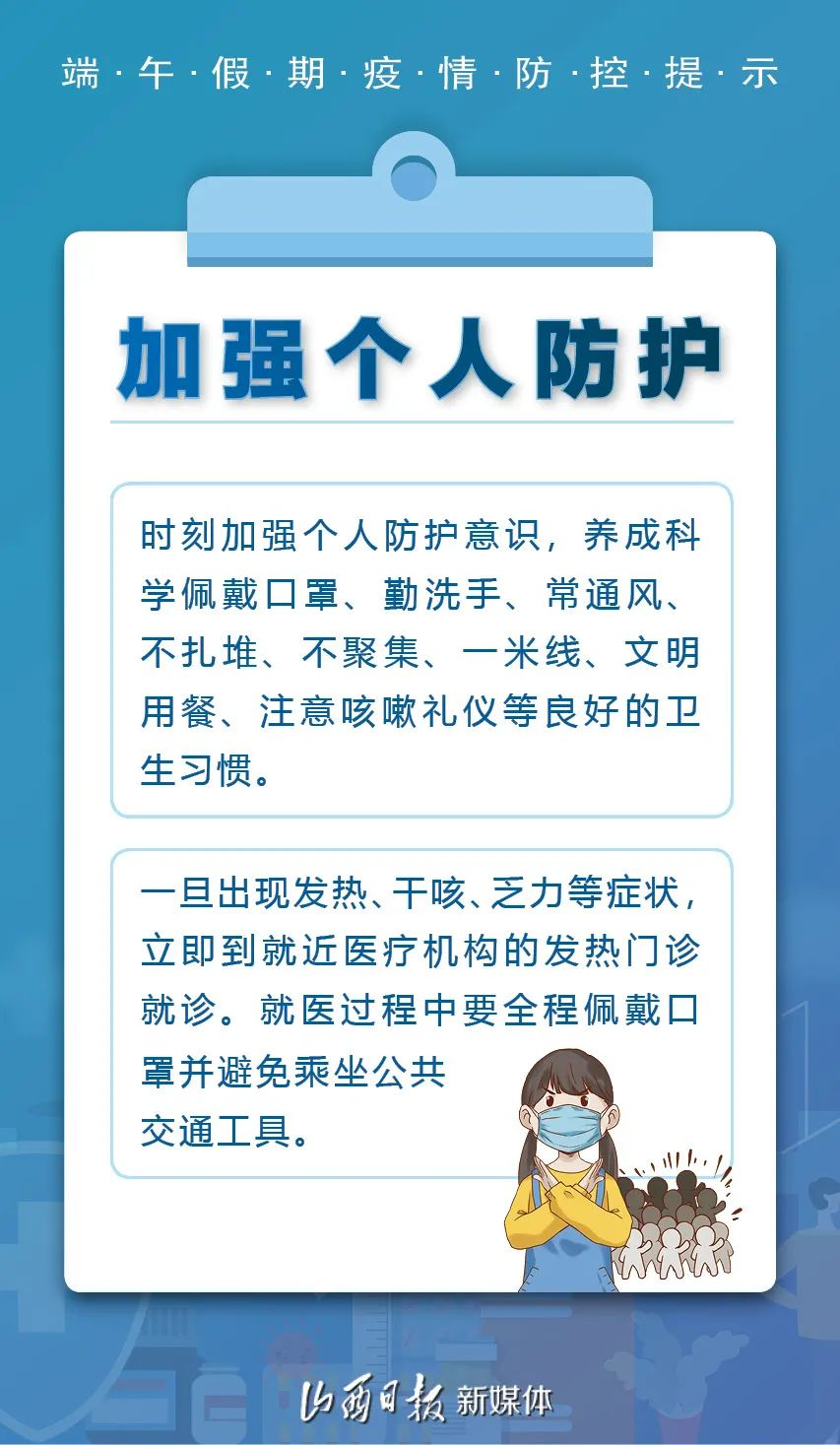端午假期來臨,人員流動和聚集性活動將明顯增加,國內(nèi)新冠肺炎疫情防控形勢依然嚴(yán)峻,全省面臨疫情輸入風(fēng)險顯著增大。 為精準(zhǔn)做好“外防輸入、內(nèi)防擴(kuò)散”,堅決切斷疫情輸入傳播途徑,保障人民群眾生命健康安全,山西省疫情防控辦發(fā)出疫情防控提示——