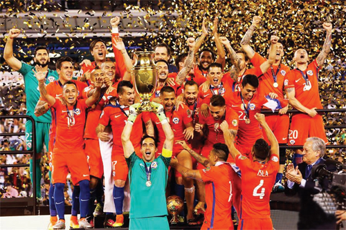 6月26日,智利隊門將布拉沃(前左一)在頒獎儀式上捧杯慶祝奪冠。當(dāng)日,2016年百年美洲杯決賽在美國新澤西舉行,智利隊與阿根廷隊在120分鐘內(nèi)0比0戰(zhàn)平,智利隊在點(diǎn)球大戰(zhàn)中以4比2戰(zhàn)勝阿根廷隊,奪得冠軍。