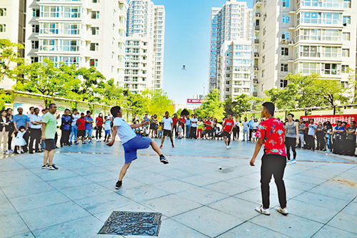 會后,來自全市各地的毽球愛好者展演了各自的絕活兒,小巧的毽球在表演者的腳尖上下翻飛,精彩迭出,高潮迭起,不斷博得觀眾的掌聲和叫好聲。(魯明強(qiáng) 攝影報道)
