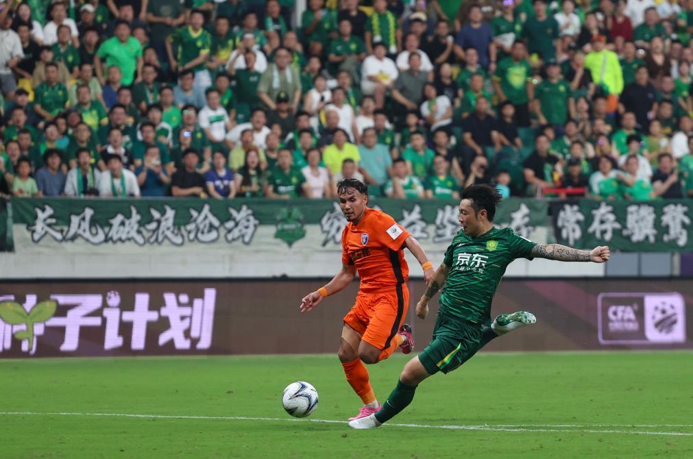 第38分鐘,老將王剛在右路突入禁區(qū)后勁射破門,幫助北京國安取得兩球領先。上半場補時階段,北京國安乘勝追擊,外援古加在禁區(qū)內推射,再入一球。