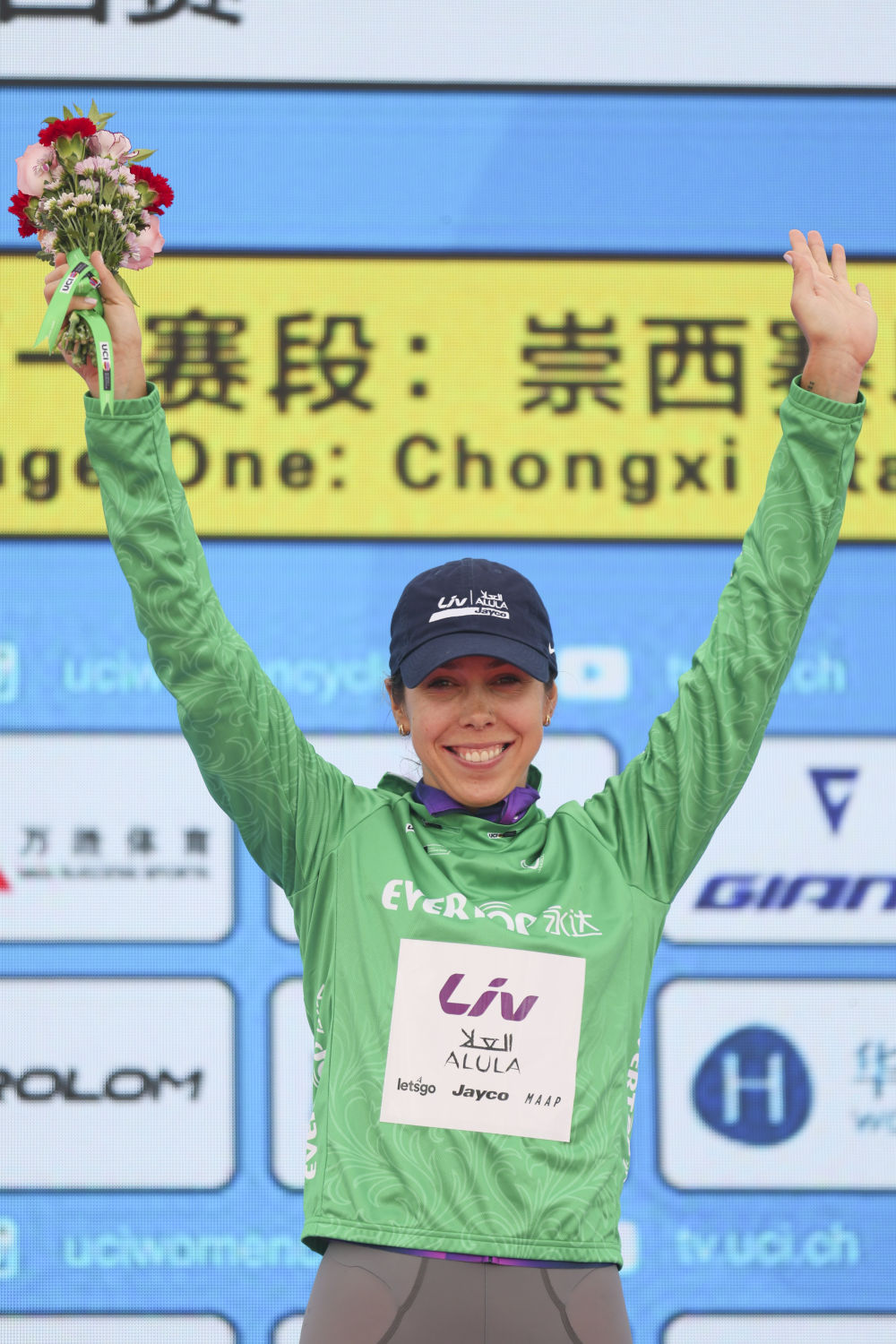 10月14日,麗芙-埃爾奧拉-杰科車隊澳大利亞車手貝克身著代表沖刺總積分第一名的綠衫在頒獎儀式上慶祝。新華社記者 王翔 攝